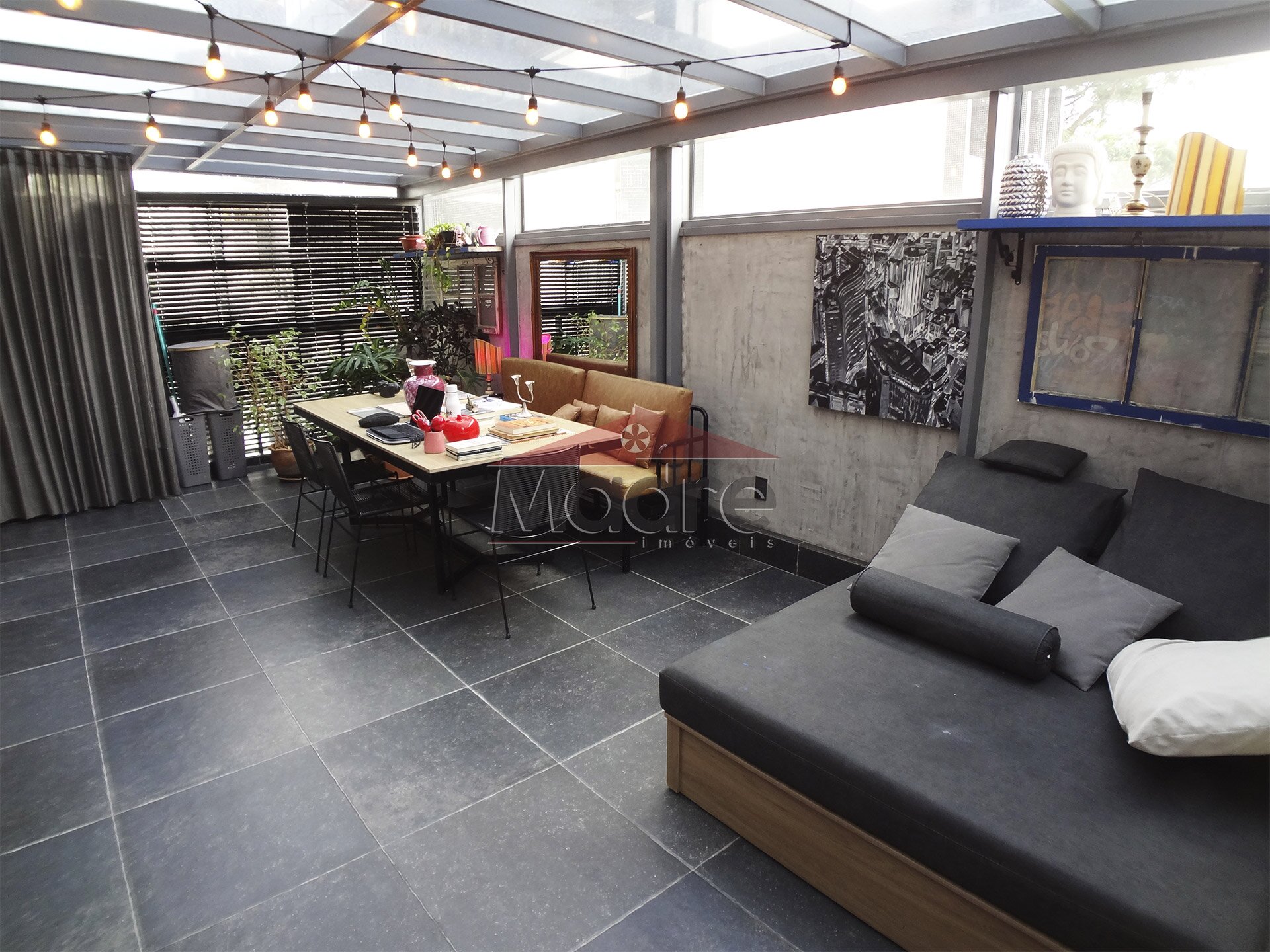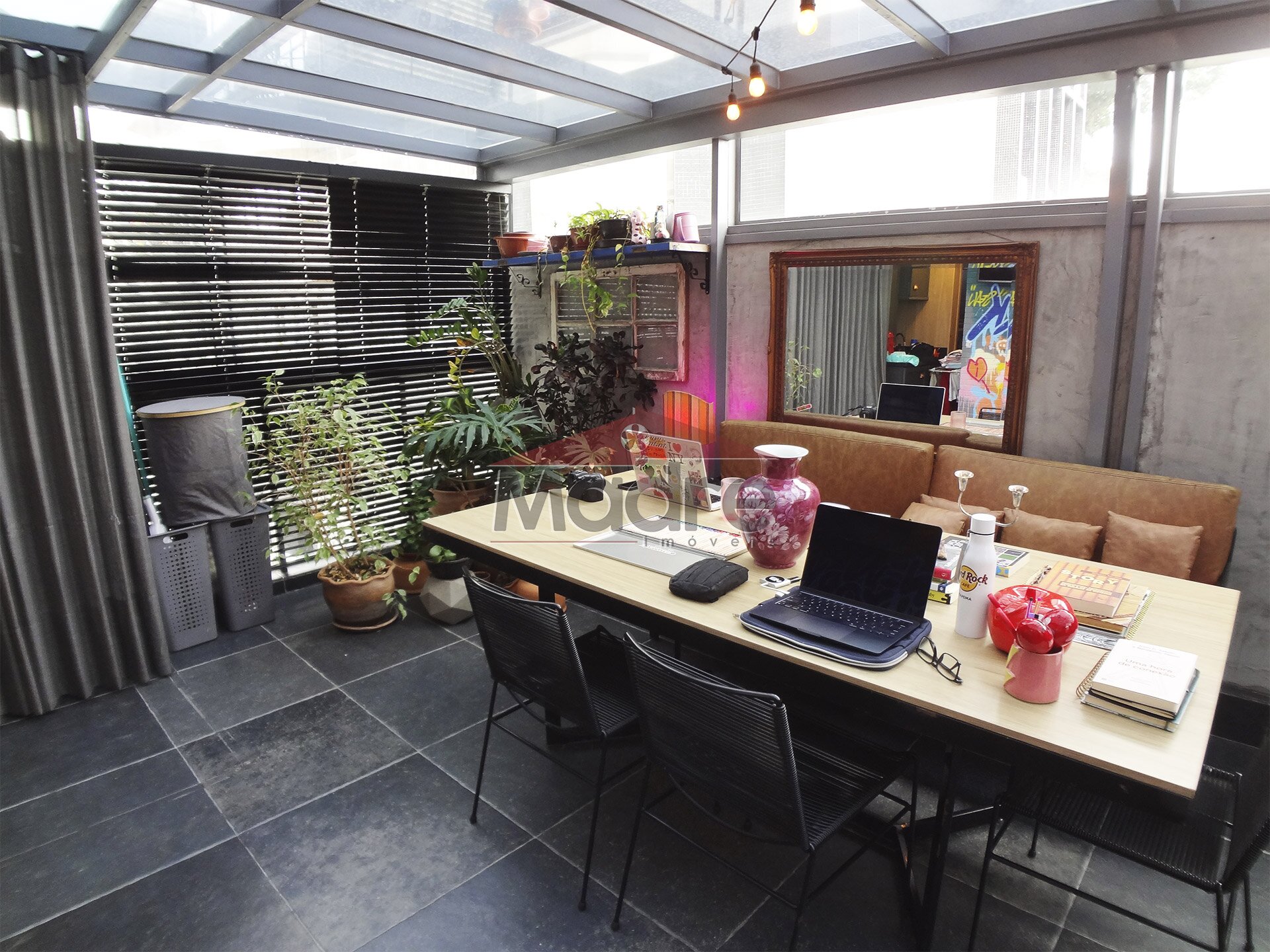 Tem vista para a rua, tem ar condicionado, o terraço garden é fechado e tem janelas, tem móveis planejados, tem decoração feita por empresa de arquitetura, tem elegância e personalidade.