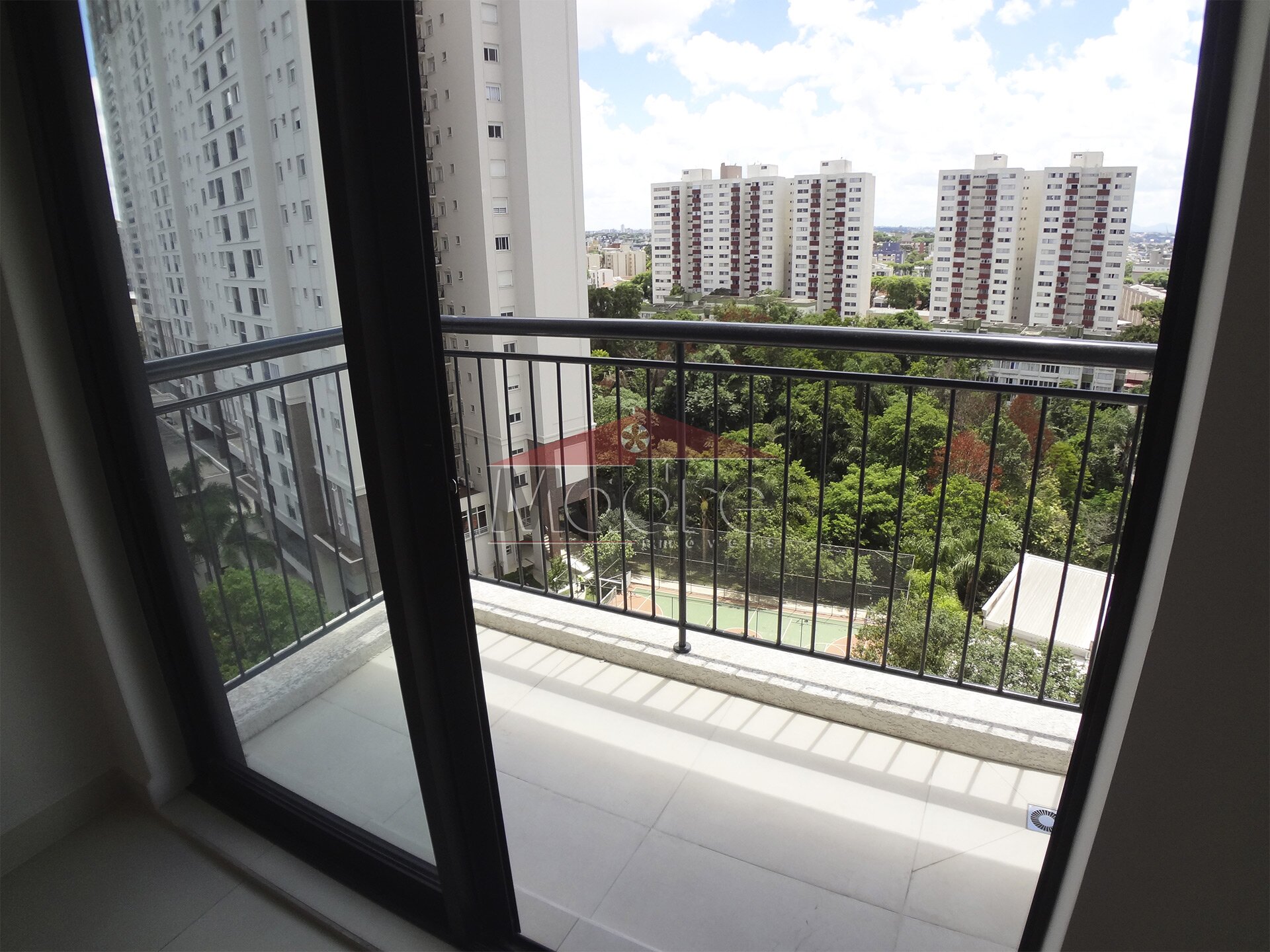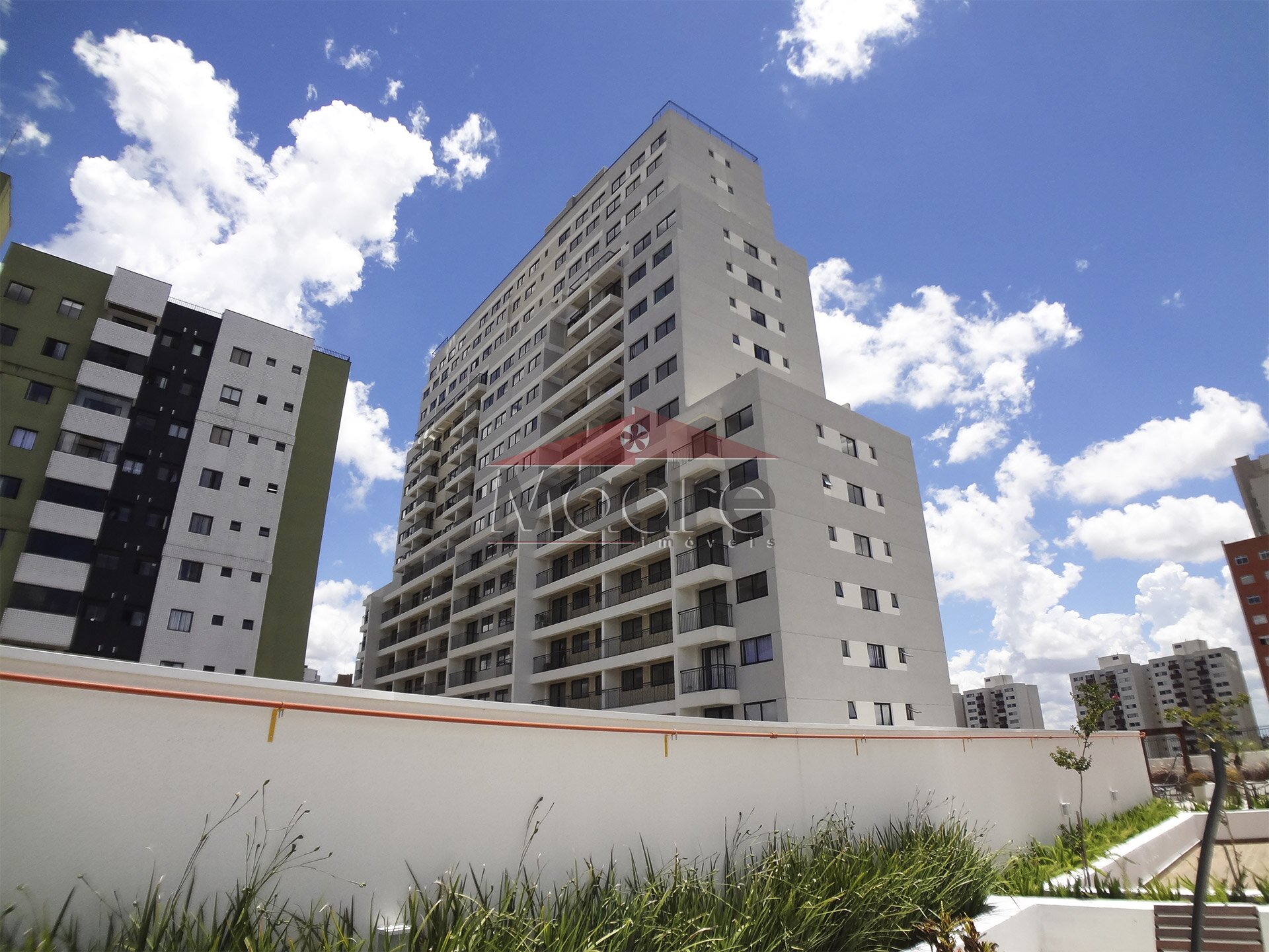 Tem uma entrada imponente com lojas e a portaria do residencial fica entrando pela galeria dessas lojas.