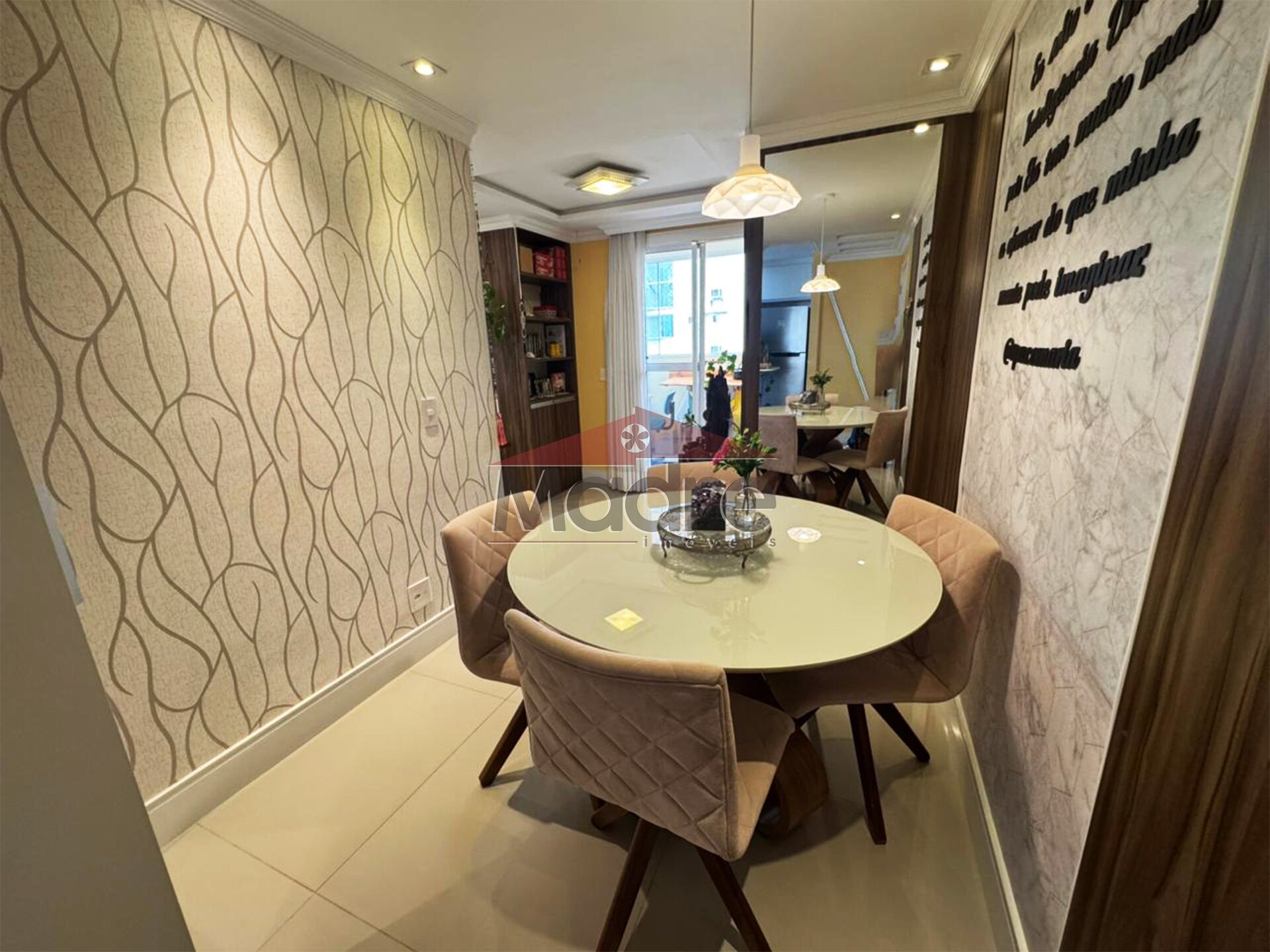 Na sala de jantar fica a mesa redonda com 4 cadeiras giratórias estofadas.