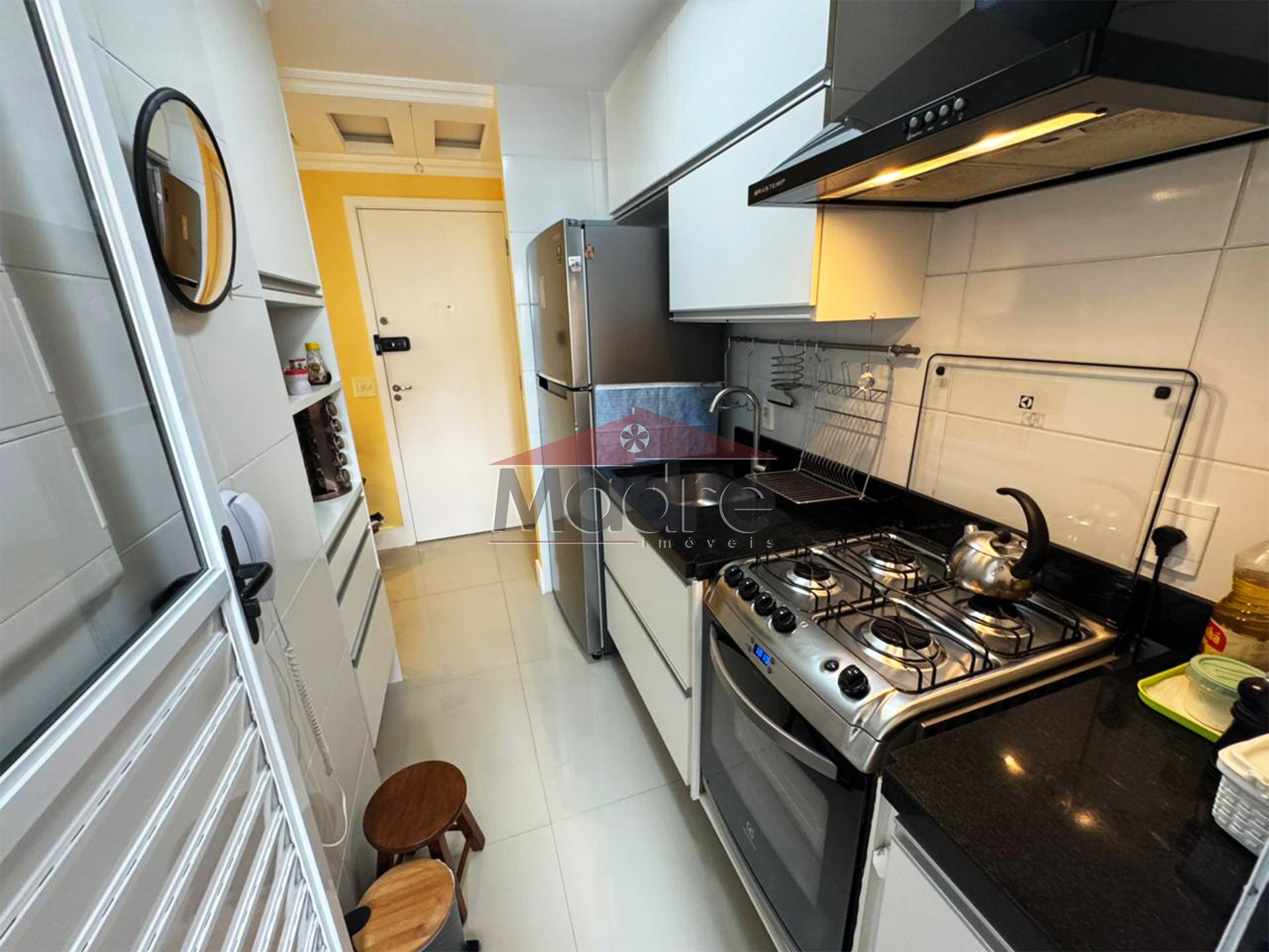 Na cozinha além de todos os armários planejados, ficam a geladeira, o fogão e o depurador exaustor de ar.