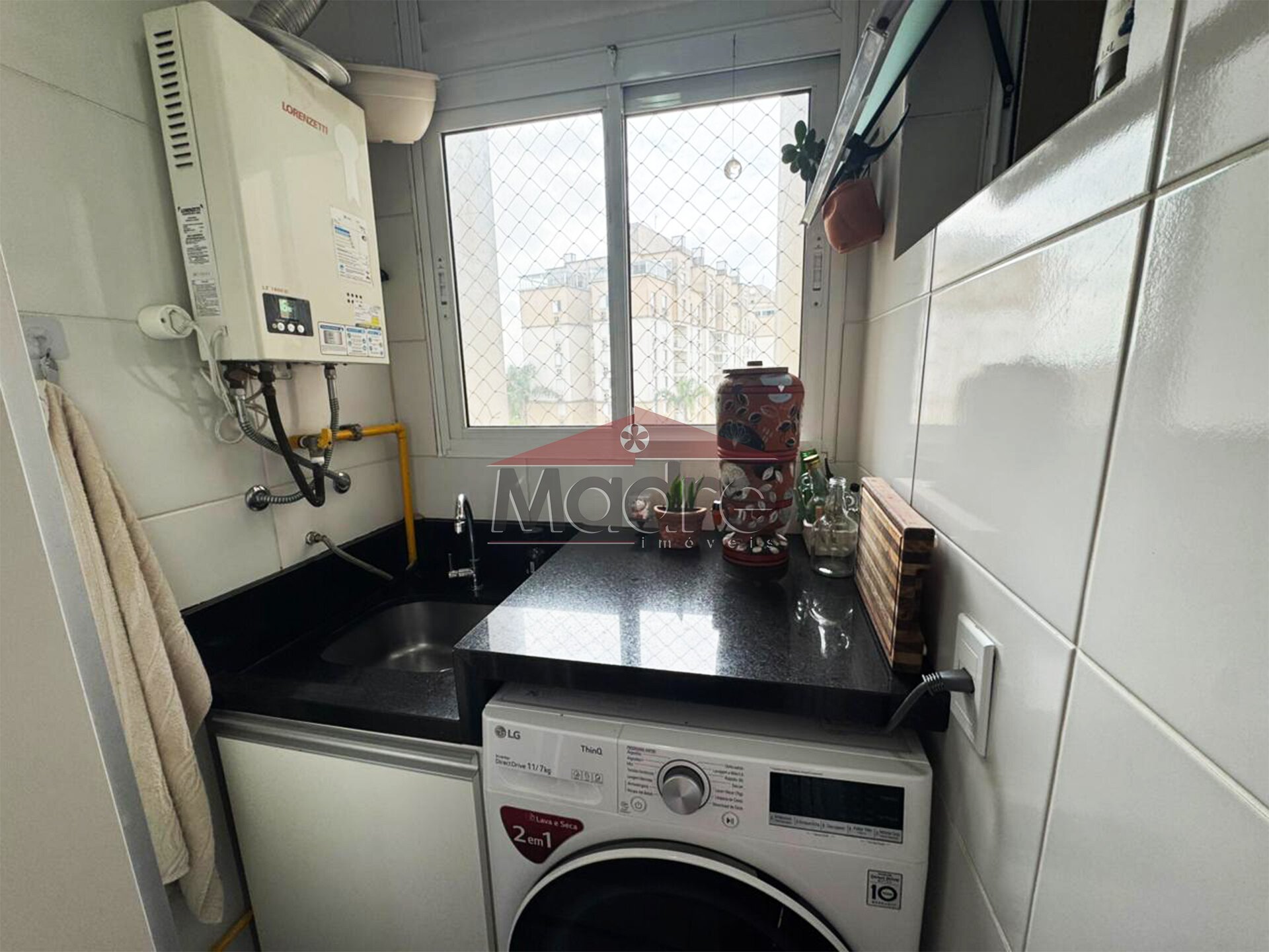 Na lavanderia fica a mobília fixa, a cuba e a máquina lava e seca.