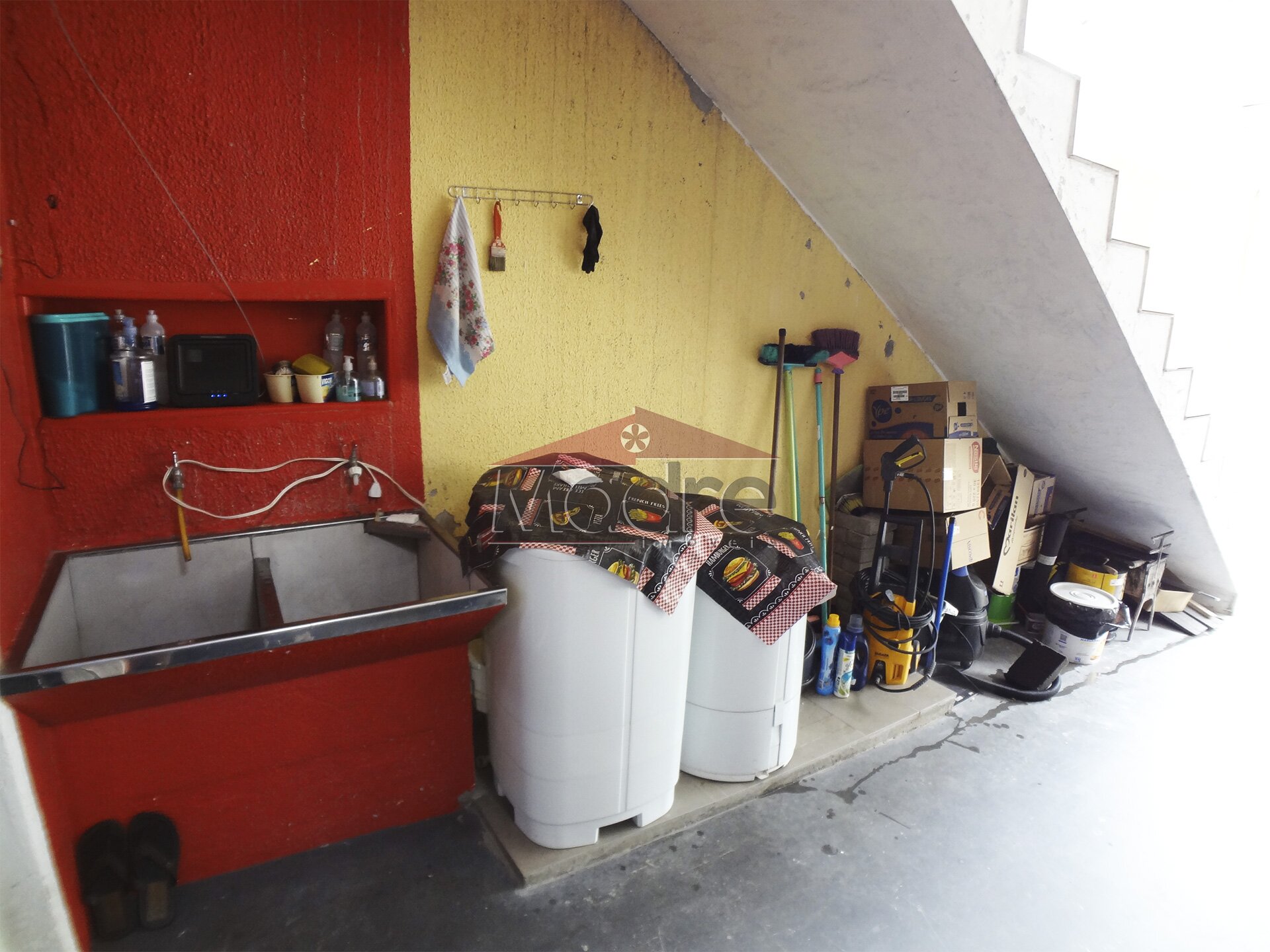 A parte debaixo do sobrado tem 1 quarto, que hoje está sendo utilizado como lavanderia, tem cozinha com armários e 1 banheiro completo.