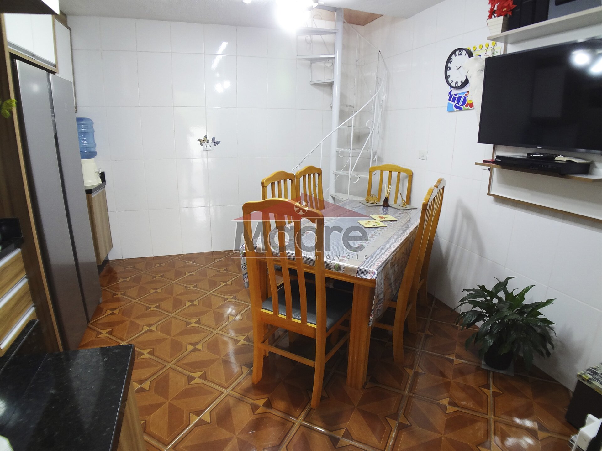 Tem duas escadas de acesso para o segundo piso, uma dentro da casa estilo caracol e outra por fora de um lance só.